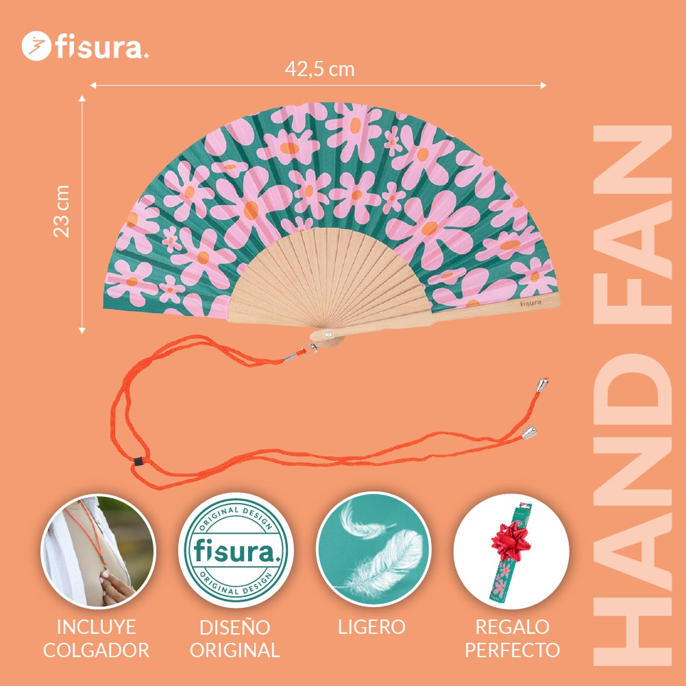 Lleva contigo este abanico verde con flores rosas 🌸 y déjate llevar por el espíritu libre de los años 70. Con su estampado hippie te transportará a una época de paz, música y buen rollo, mientras te refrescas con estilo en los días más calurosos. ¡Y podrás darle a tus looks veraniegos un toque retro muy divertido!