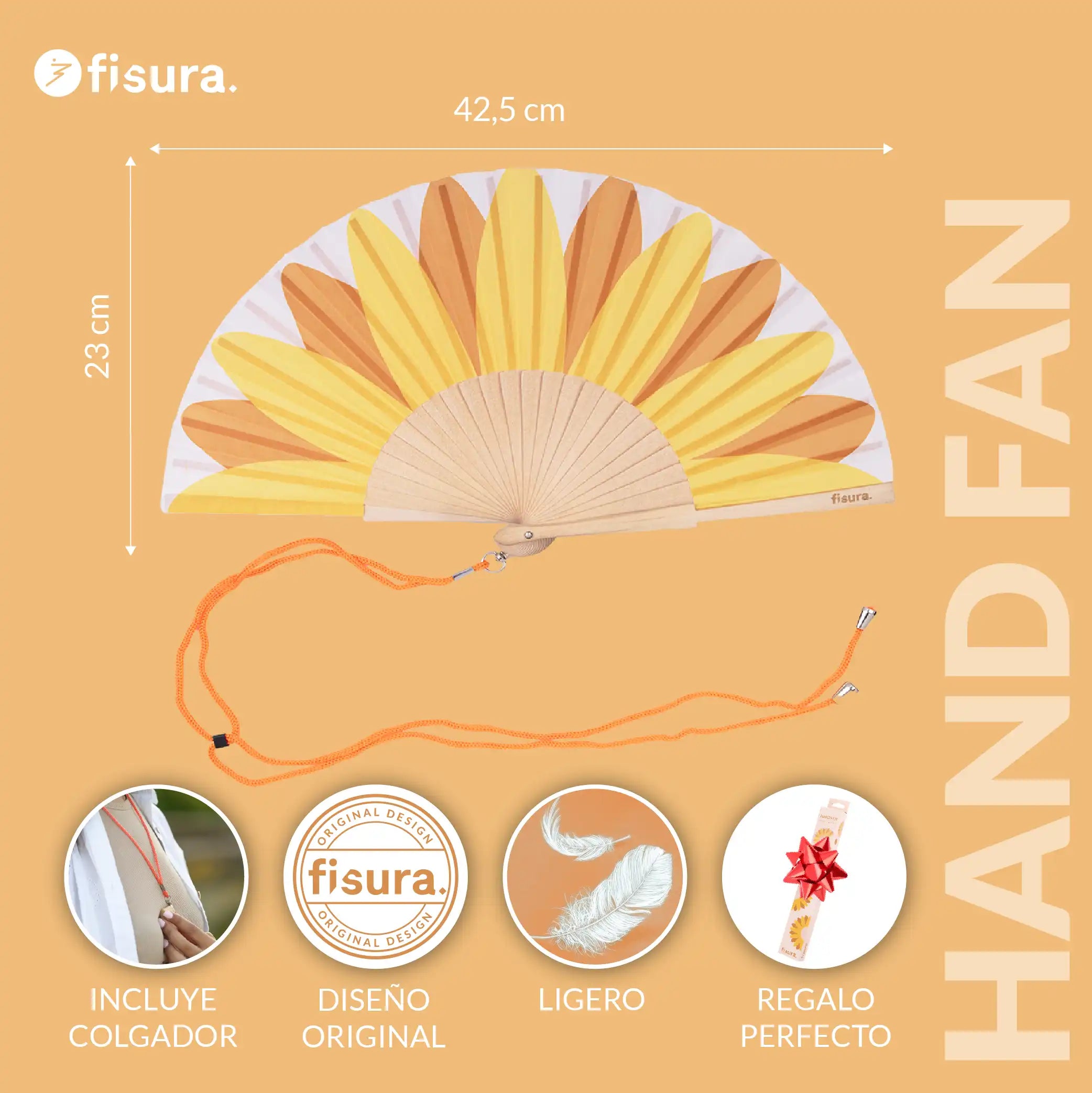 Si como un girasol, siempre estás buscando el sol, este abanico es ideal para ti 🌻 y es que con su estampado de girasoles llenará tus días de luz y energía. Además, incluye un práctico colgador para que puedas tenerlo siempre a mano y que no se te pierda ni se te olvide. ¡Cuélgatelo y olvídate de rebuscarlo en tu bolso o mochila 🎒 cuando necesites abanicarte!