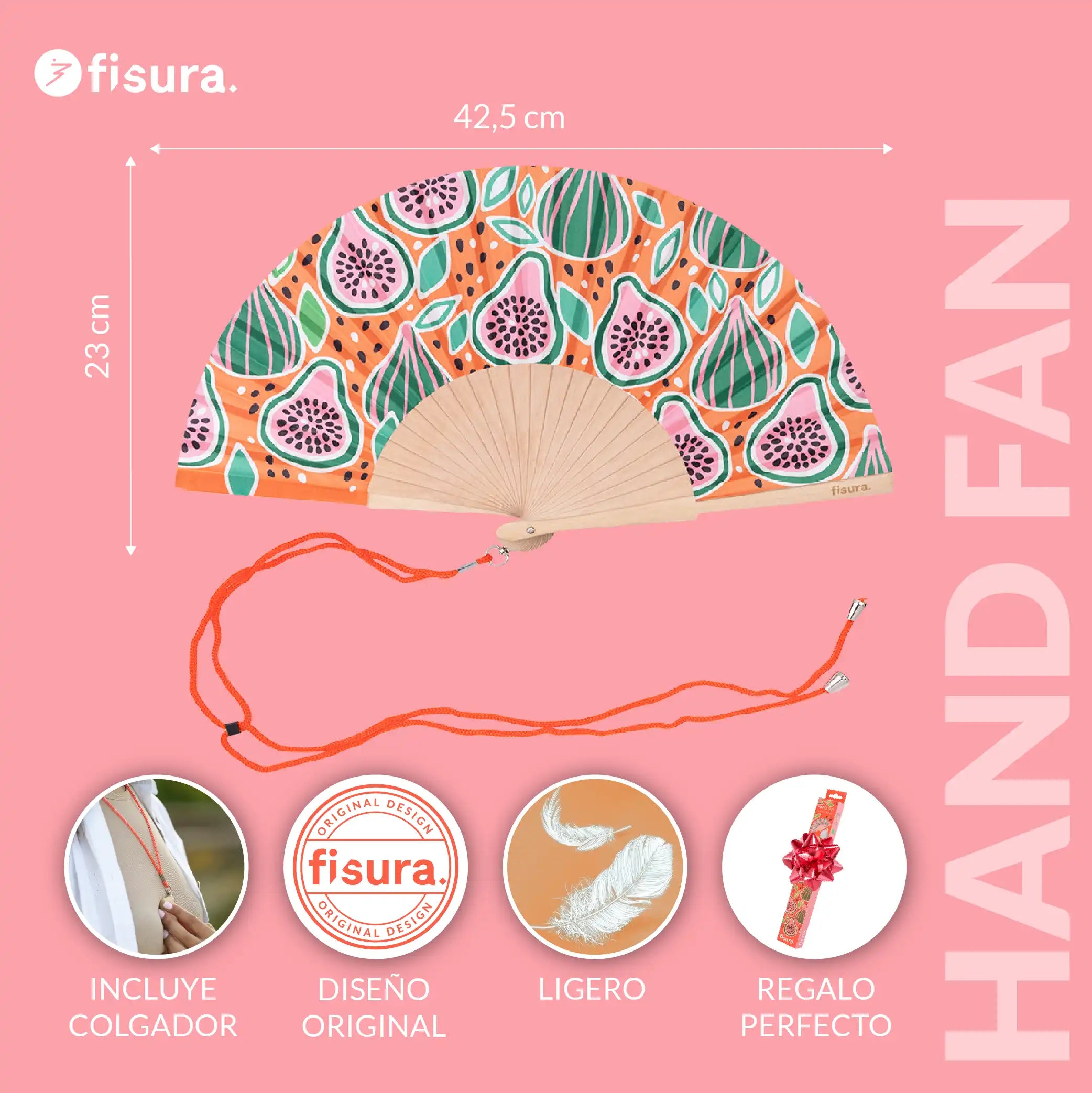 Dale un aire fresco y mediterráneo a tus looks veraniegos con este abanico naranja 🧡 con estampado de higos que te ayudará a luchar contra la ola de calor de la manera más cool. Además, incluye un práctico colgador para que siempre lo tengas a mano. ¡Cuélgatelo y olvídate de rebuscarlo en el bolso o la mochila 🎒 cuando más lo necesites!