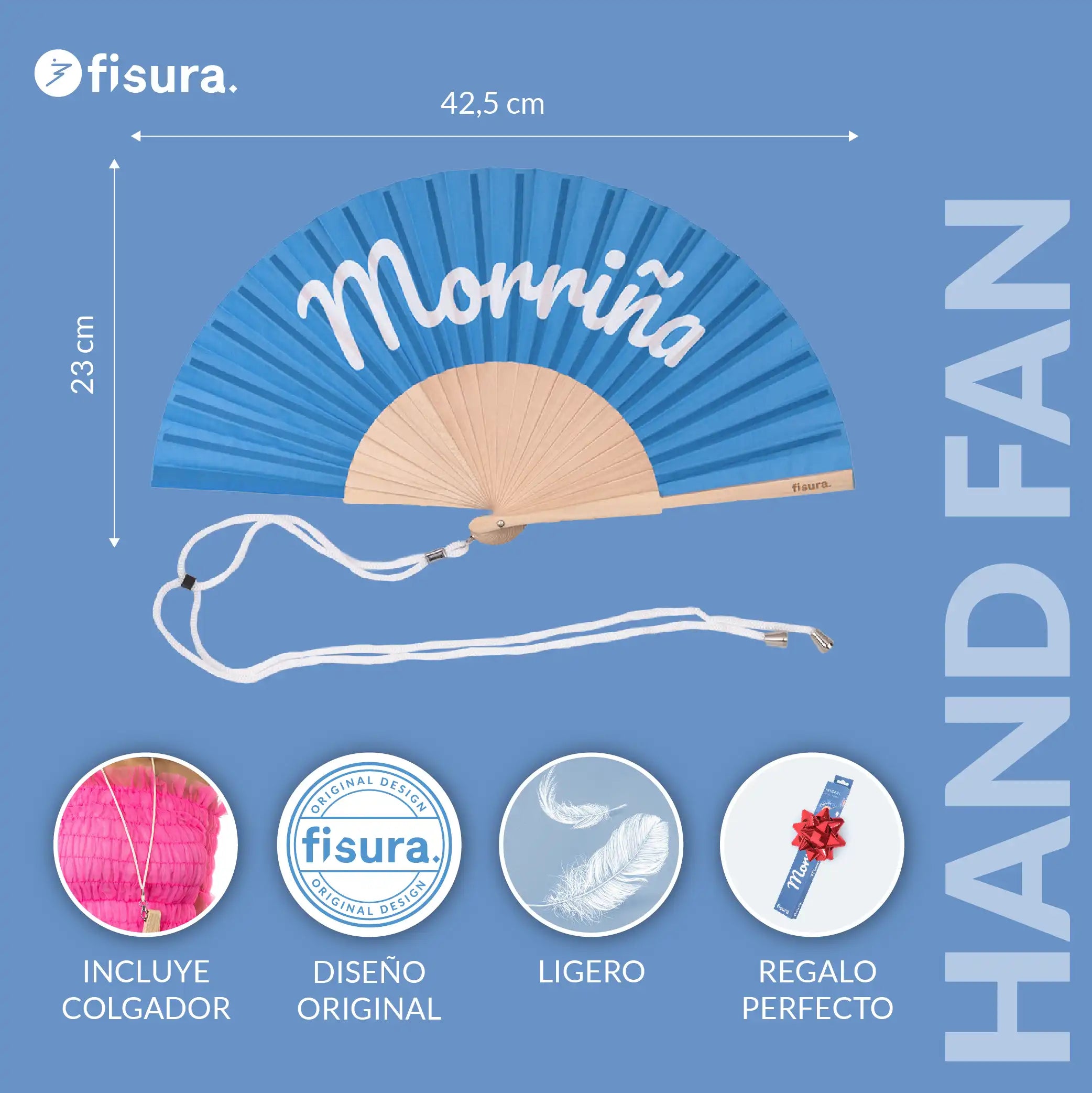 El abanico azul es perfecto para darle a tus looks veraniegos un toque colorido . Además, incluye un práctico colgador para que puedas tenerlo siempre a mano y que no se te pierda ni se te olvide. ¡Cuélgatelo y olvídate de rebuscarlo en tu bolso o mochila 🎒 cuando necesites abanicarte!