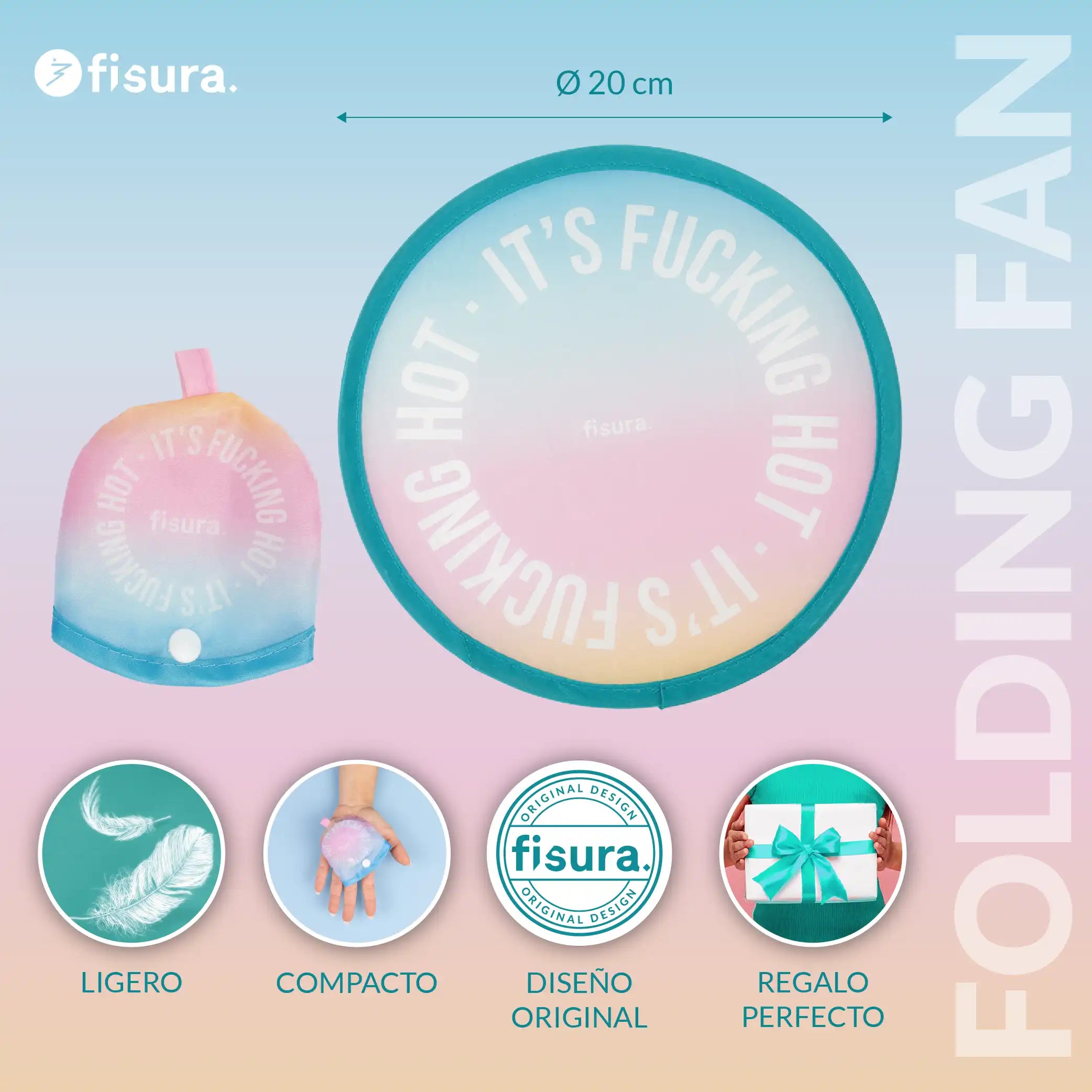 Sobrevive a la ola de calor con este abanico original degradado con el mensaje “it’s fucking hot” 🔥 con el que le darás a tus looks veraniegos un toque “hater” y colorido y dejarás claro que estás harto de las altas temperaturas. Y cuando ya no necesites abanicarte más… ¡simplemente agarra los extremos de este abanico redondo, gíralo y ¡voilà!, estará cerrado y listo para acompañarte en mil y una aventuras más.