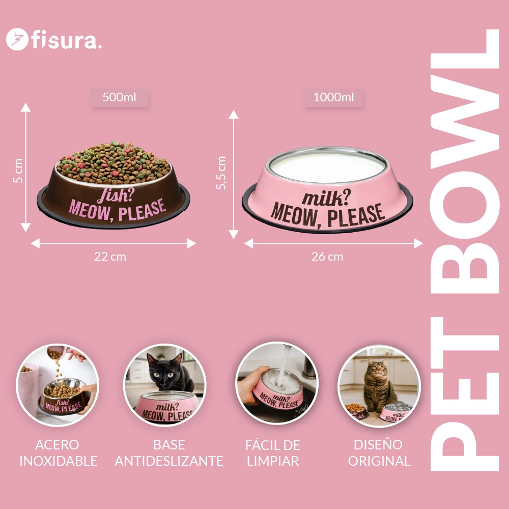 Con su mensaje “Fish? meow please. Milk? meow please.” este pack de comedero y bebedero para gatos deja claro quién manda en casa. Además, son comederos de acero inoxidable por lo que son resistentes y fáciles de limpiar.