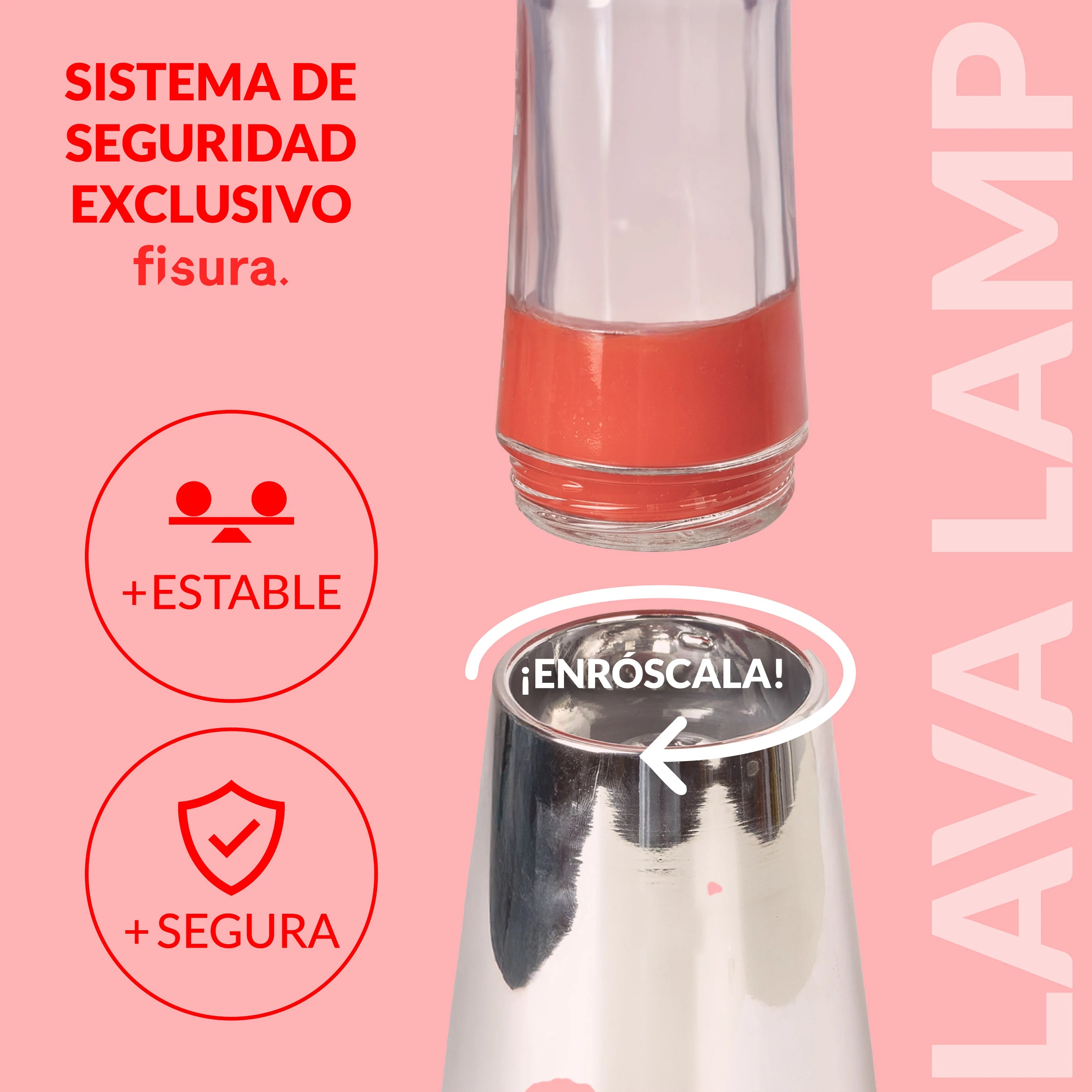 Olvídate de los sustos inesperados, esta lámpara original cuenta con un sistema de roscado entre la base y la botella que garantiza que la lámpara se mantendrá firme pase lo que pase. ¡No habrá más tambaleos ni accidentes, solo lava fluyendo y tranquilidad total!