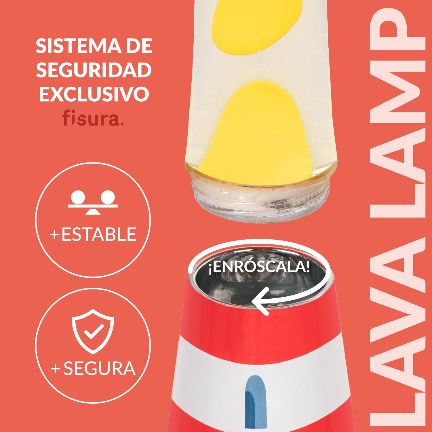 Olvídate de los sustos inesperados, esta lámpara original cuenta con un sistema de roscado entre la base y la botella que garantiza que la lámpara se mantendrá firme pase lo que pase. ¡No habrá más tambaleos ni accidentes, solo lava fluyendo y tranquilidad total!