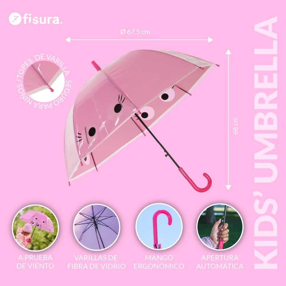 Este paraguas transparente rosa con estampado de ojitos curiosos 👀 llenará cualquier día gris en pura diversión. ¡Los peques podrán ver el mundo a través de su paraguas y sentirse como auténticos exploradores mientras caminan bajo la lluvia!
