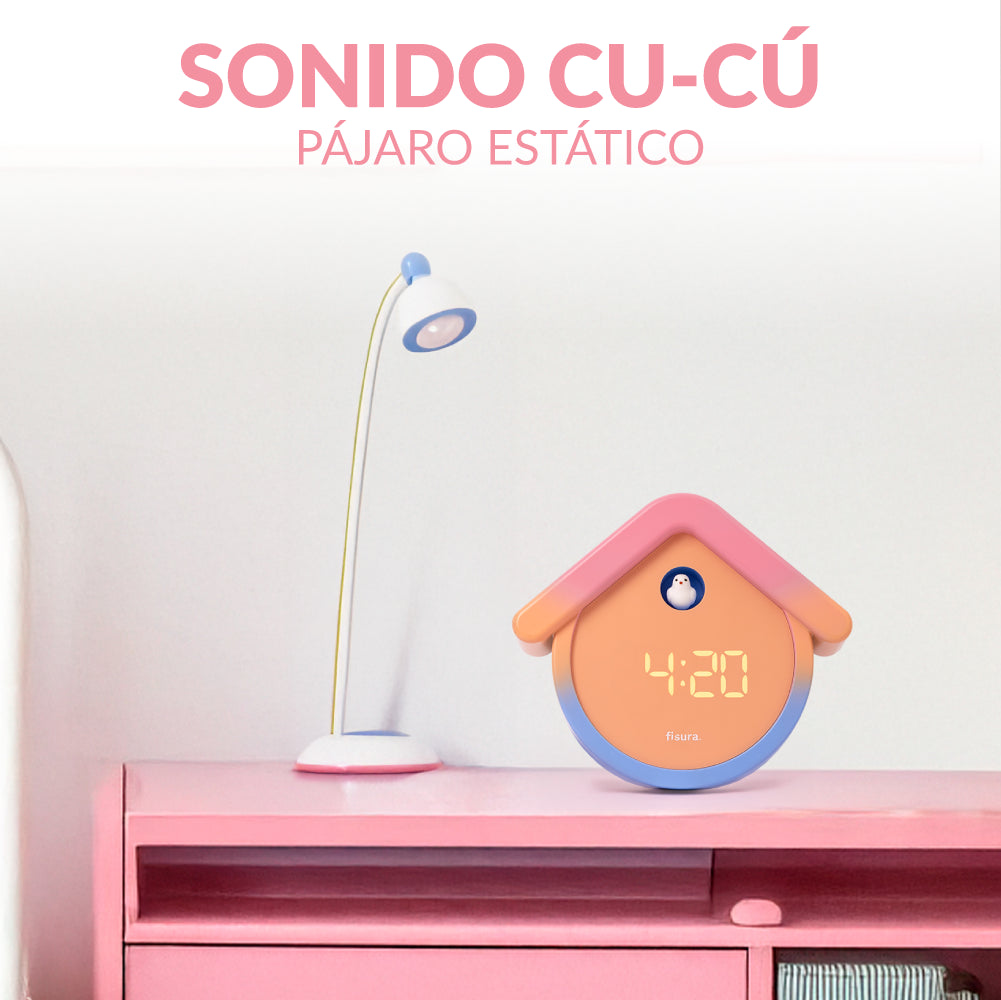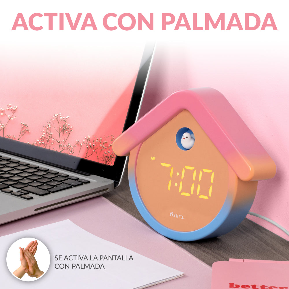 Este reloj despertador digital con forma de casita con tonos degradados es ideal para darle un toque moderno y original a tu mesita de noche, escritorio o estantería. ¡Y su cuco que no sale del nido te mirará con cara de “venga, levántate ya que hay que empezar el día”!