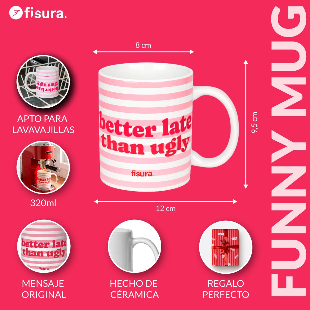 Si tu lema es “antes muerta que sencilla… y antes tarde que mal arreglada” 💄, esta taza original con el mensaje “better late than ugly” se convertirá en tu mejor aliado. Y con su capacidad de 320 ml, es la taza de desayuno perfecta para llenarla de café ☕, té o chocolate mientras preparas tu outfit del día sin sentir la presión del paso de los minutos.