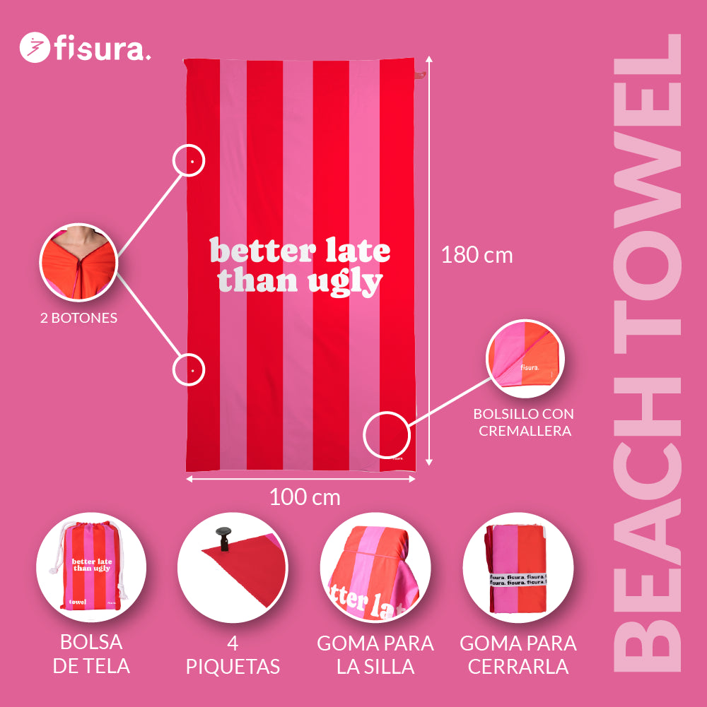 Es una toalla de microfibra por lo que es ligera, de secado rápido y repele la arena por lo que podrás disfrutar sin que se te pegue la arena al cuerpo. Y, con el mensaje “better late than ugly” 💄 de esta toalla rosa y roja de rayas quedará claro que prefieres llegar tarde pero bien bronceada.