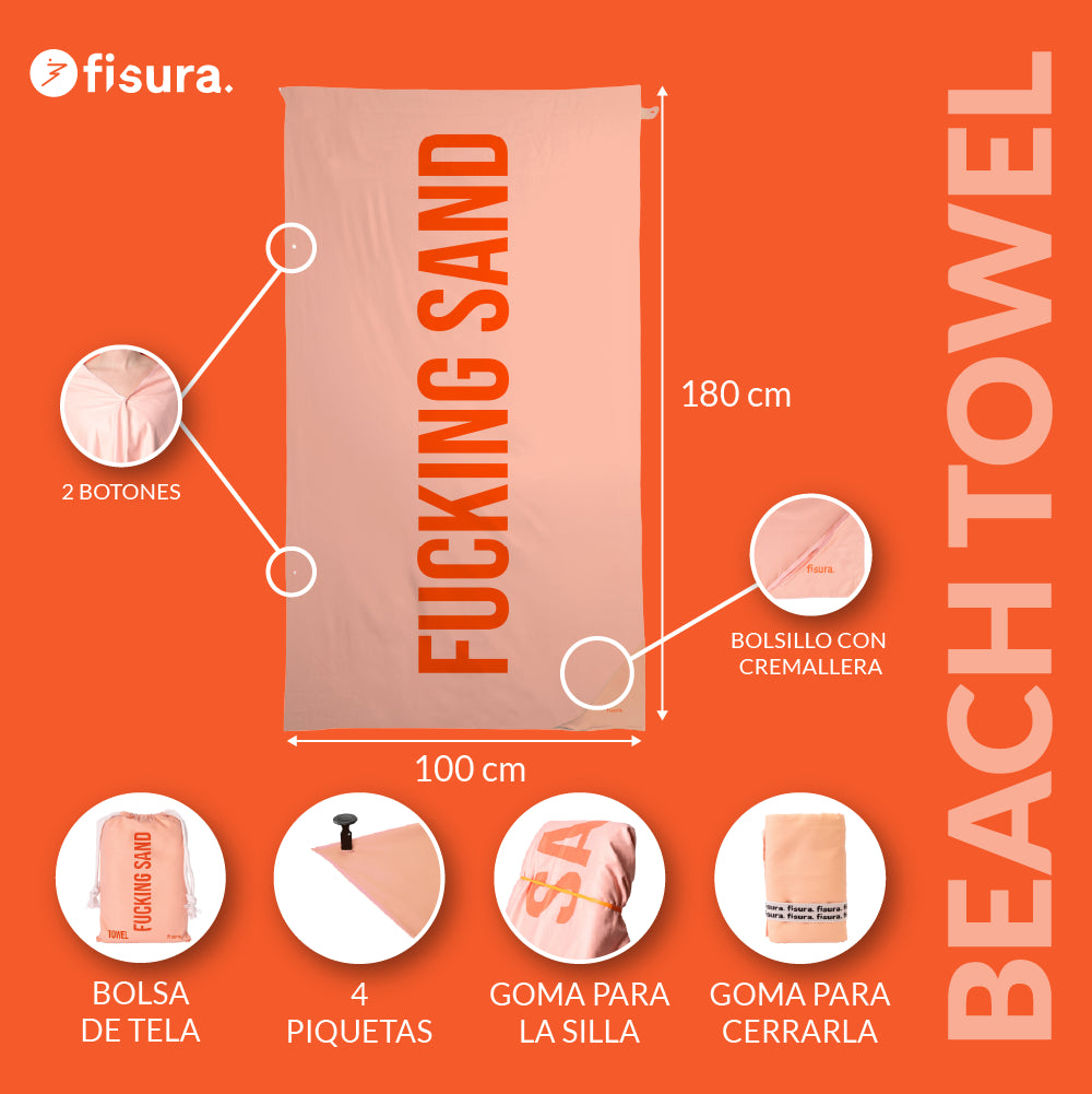 Con el mensaje “fucking sand” de esta toalla naranja dejarás claro que, para ti, lo peor de la playa no es el sol abrasador ☀️, es la maldita arena que se te pegue por todos lados y se cuela en tu refresco y hasta en tu bocadillo. Y, al ser una toalla de microfibra es ligera, de secado rápido y repele la arena por lo que podrás disfrutar sin que la arena te arruine el día.
